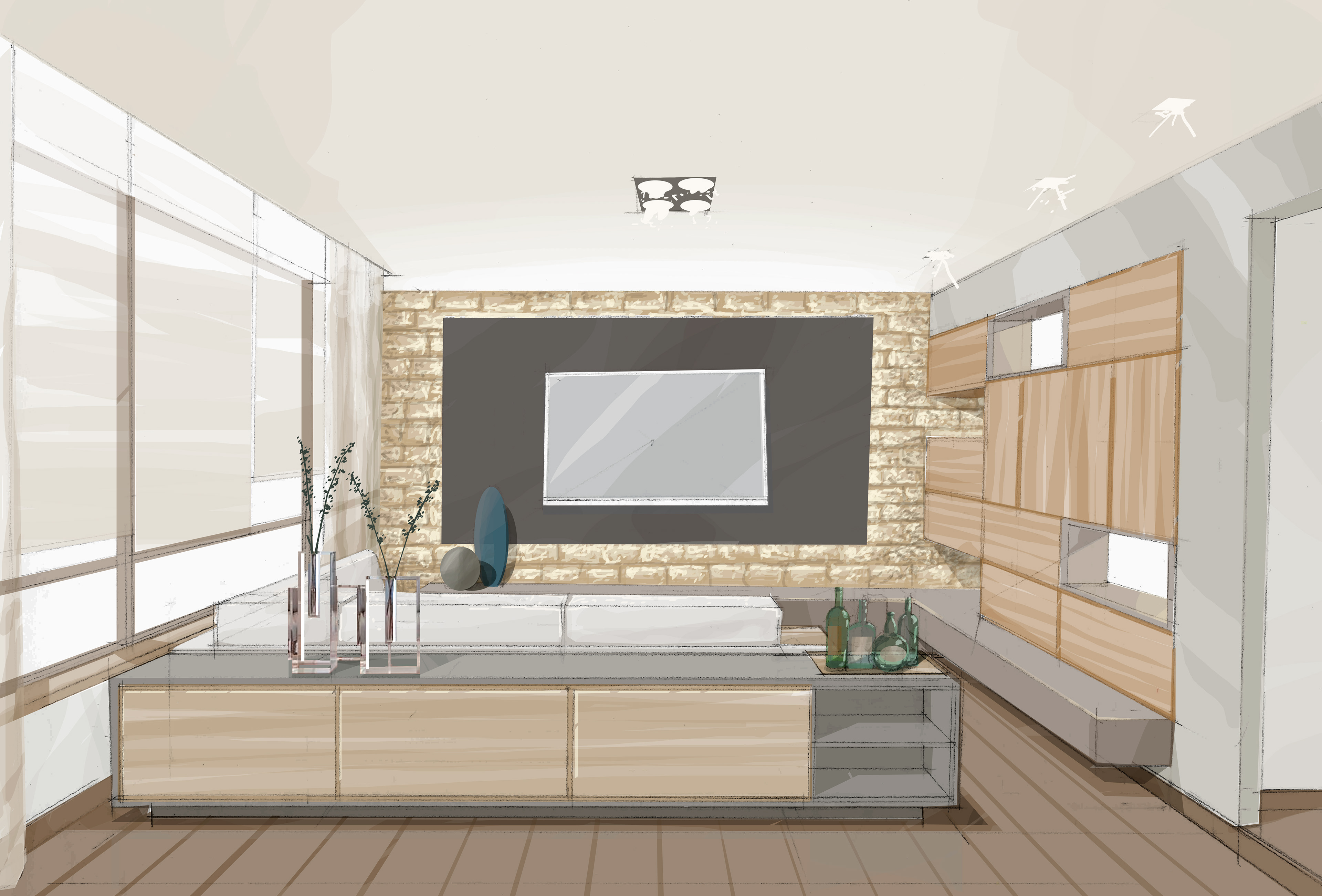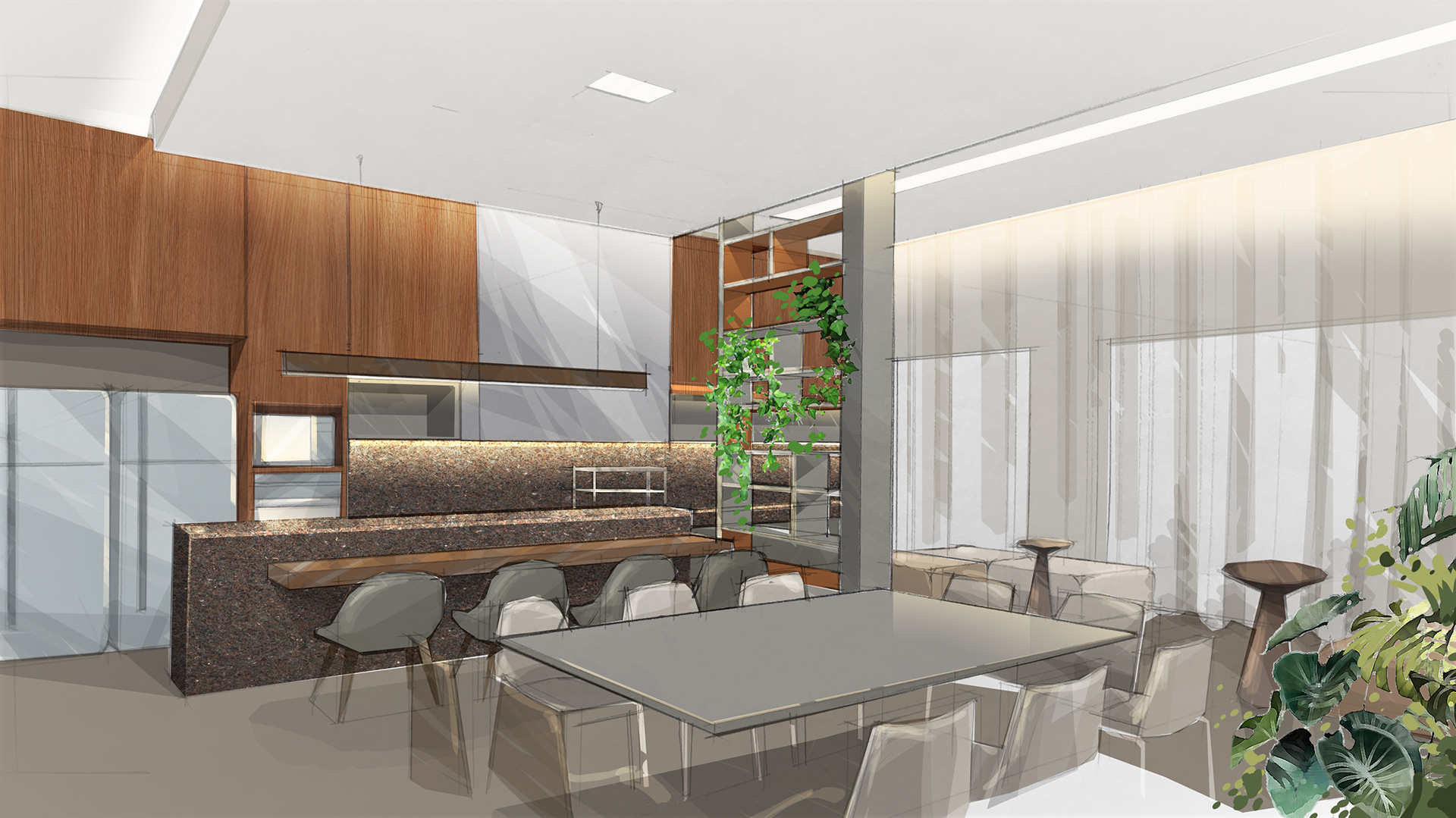 My artistic perspectives blend the precision of hand-drawn strokes with the versatility of digital painting. Starting from digitized graphite sketches, I use Photoshop to explore texture and light. The results range from dynamic conceptual studies to polished illustrations that help validate material choices and the final atmosphere of the space.